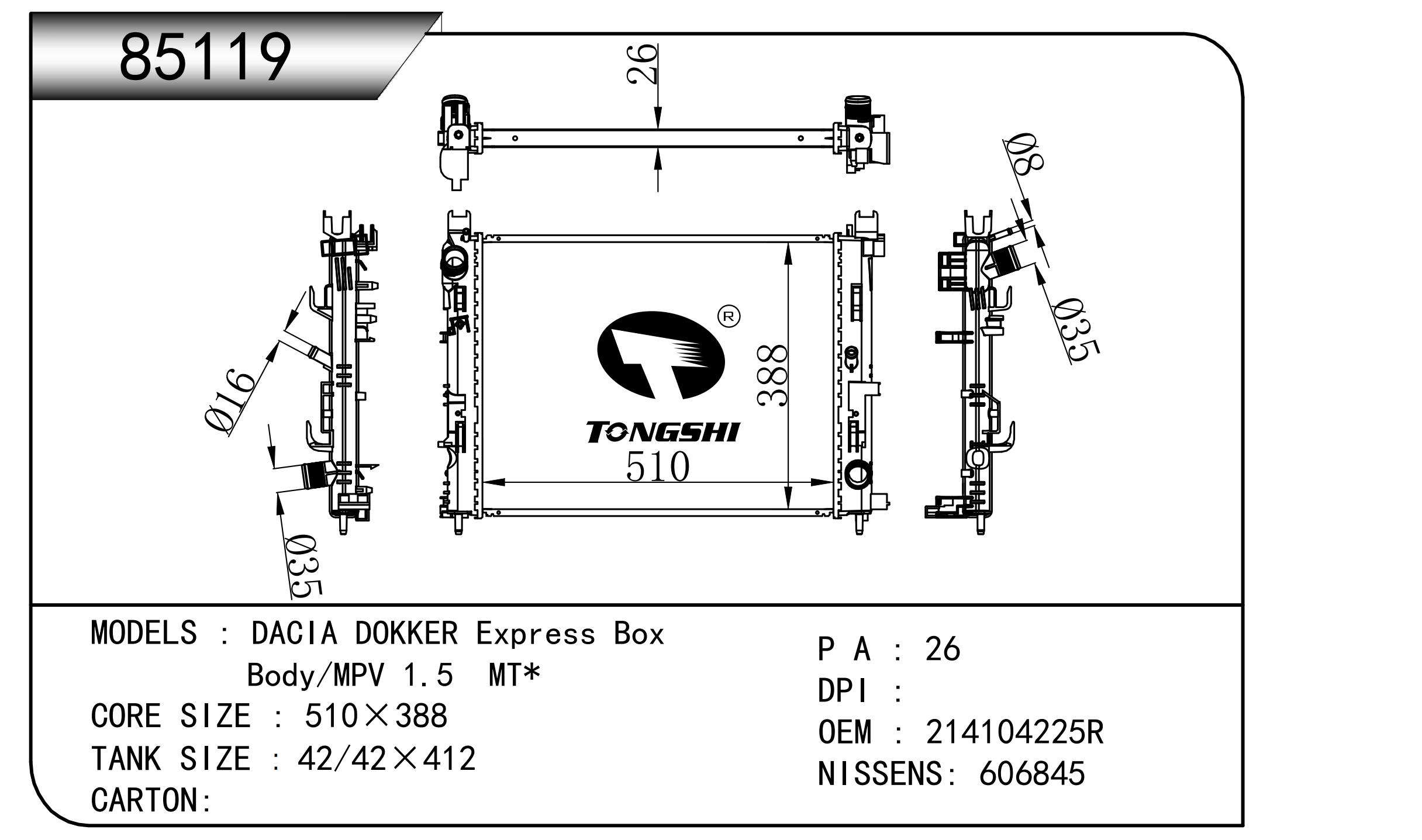 適用于奇瑞瑞虎(新款) MT散熱器 OEM : F1301000B1