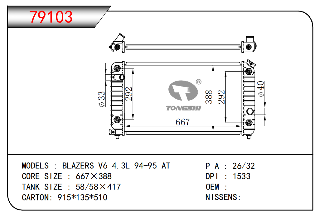 適用于奇瑞瑞虎(新款) MT散熱器 OEM : F1301000B1