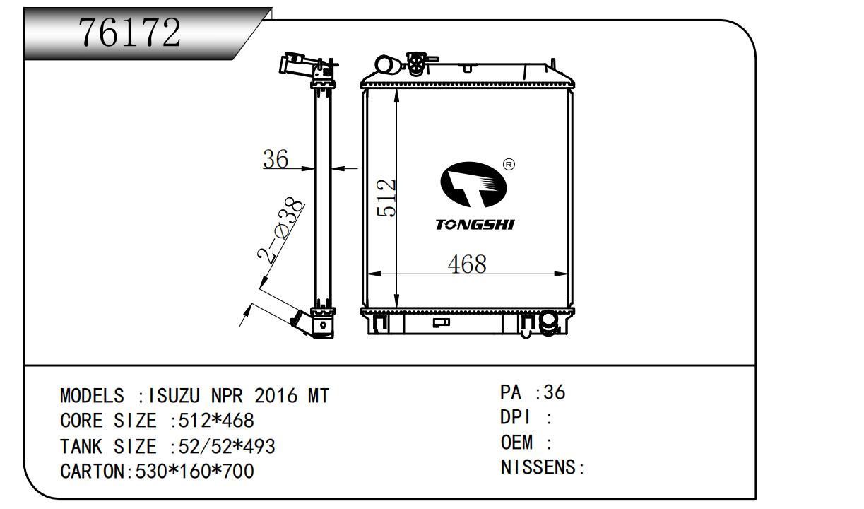 適用于奇瑞瑞虎(新款) MT散熱器 OEM : F1301000B1