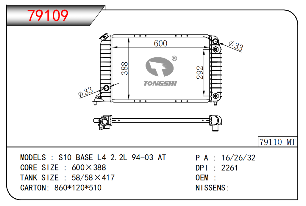 適用于奇瑞瑞虎(新款) MT散熱器 OEM : F1301000B1