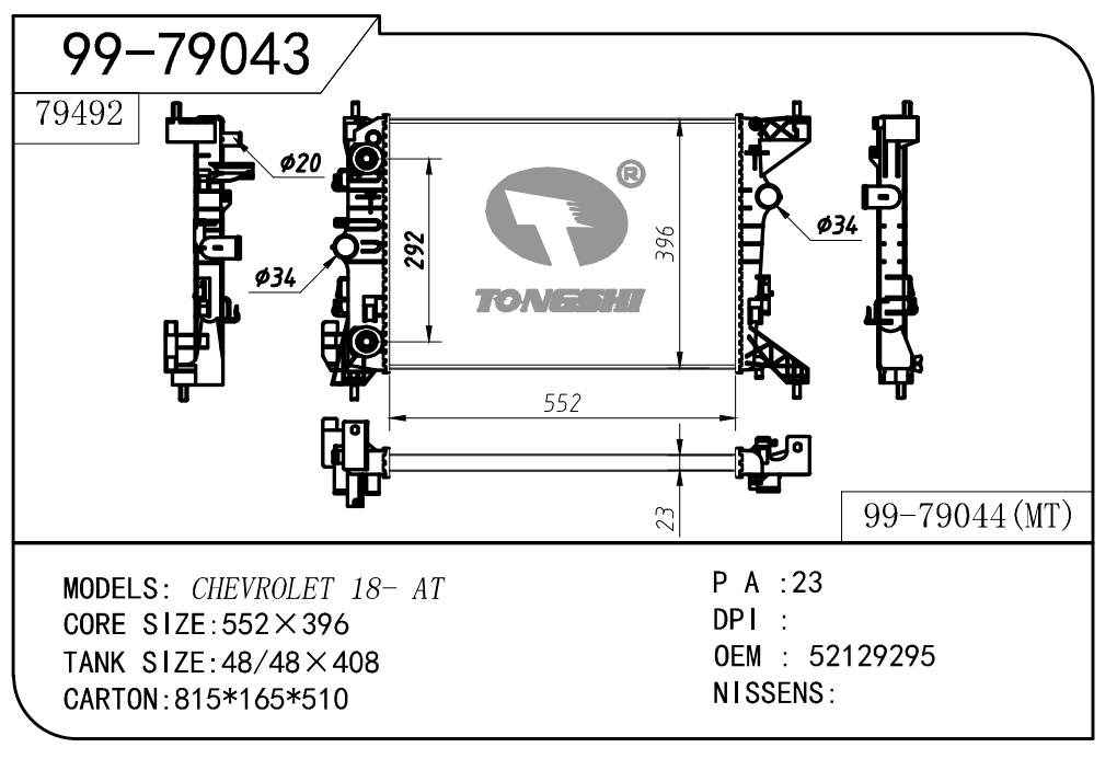 適用于奇瑞瑞虎(新款) MT散熱器 OEM : F1301000B1