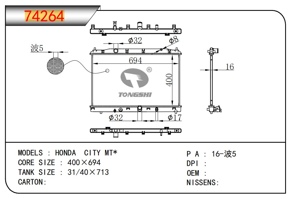適用于奇瑞瑞虎(新款) MT散熱器 OEM : F1301000B1