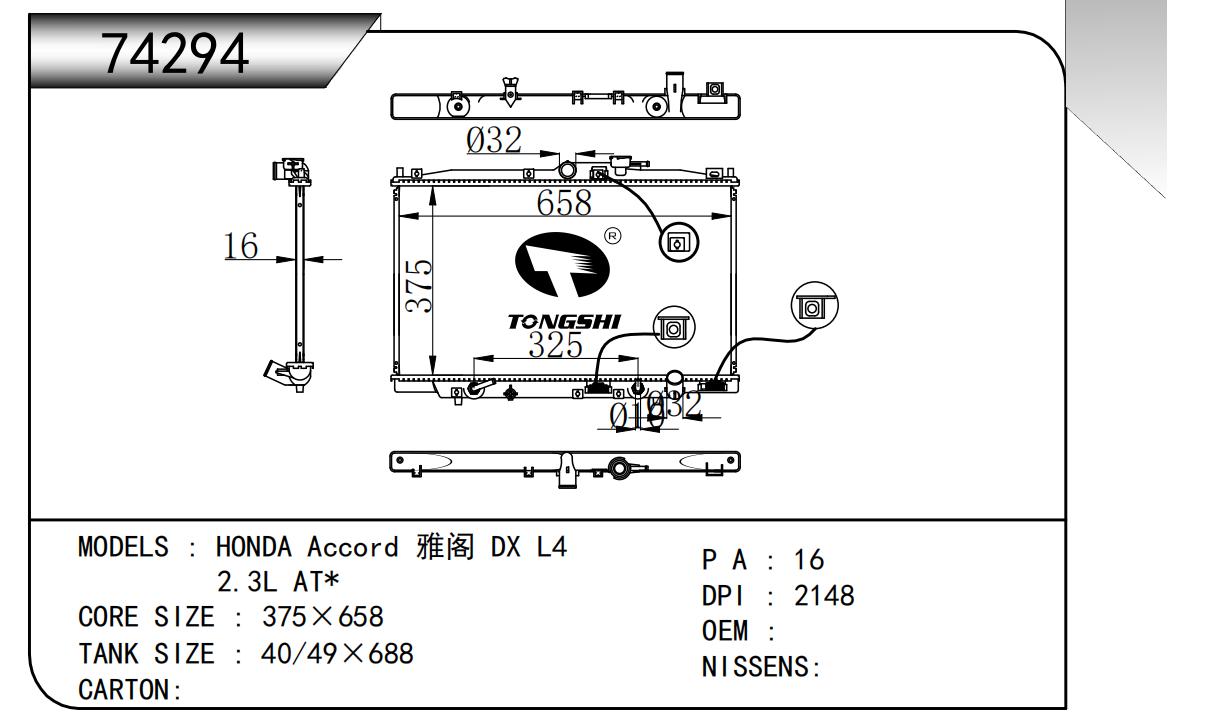 適用于奇瑞瑞虎(新款) MT散熱器 OEM : F1301000B1