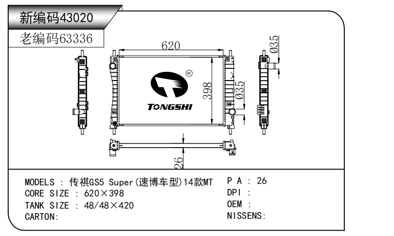 適用于奇瑞瑞虎(新款) MT散熱器 OEM : F1301000B1