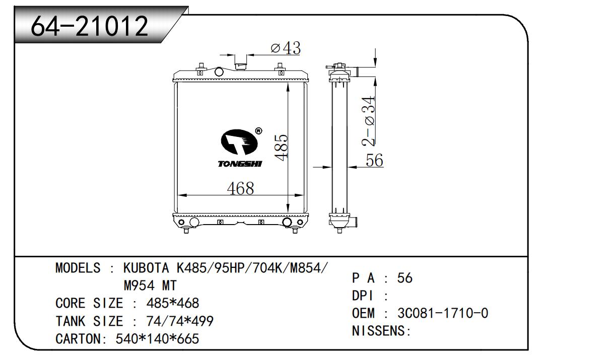 適用于奇瑞瑞虎(新款) MT散熱器 OEM : F1301000B1