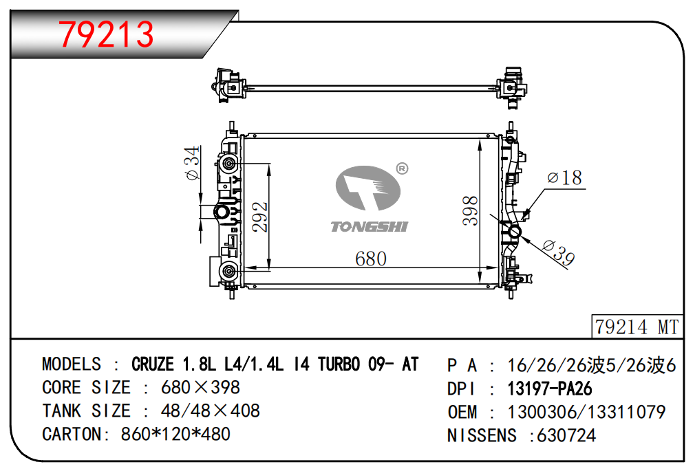 適用于奇瑞瑞虎(新款) MT散熱器 OEM : F1301000B1