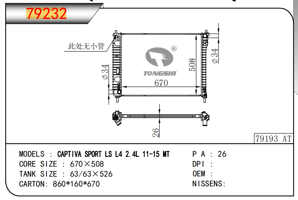 適用于奇瑞瑞虎(新款) MT散熱器 OEM : F1301000B1