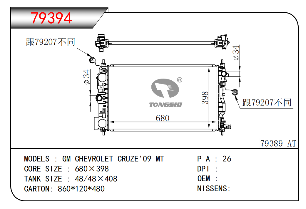 適用于奇瑞瑞虎(新款) MT散熱器 OEM : F1301000B1