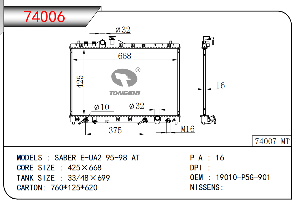 適用于奇瑞瑞虎(新款) MT散熱器 OEM : F1301000B1