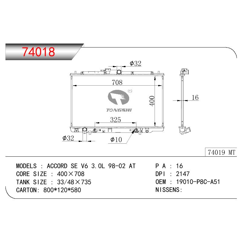 適用于奇瑞瑞虎(新款) MT散熱器 OEM : F1301000B1