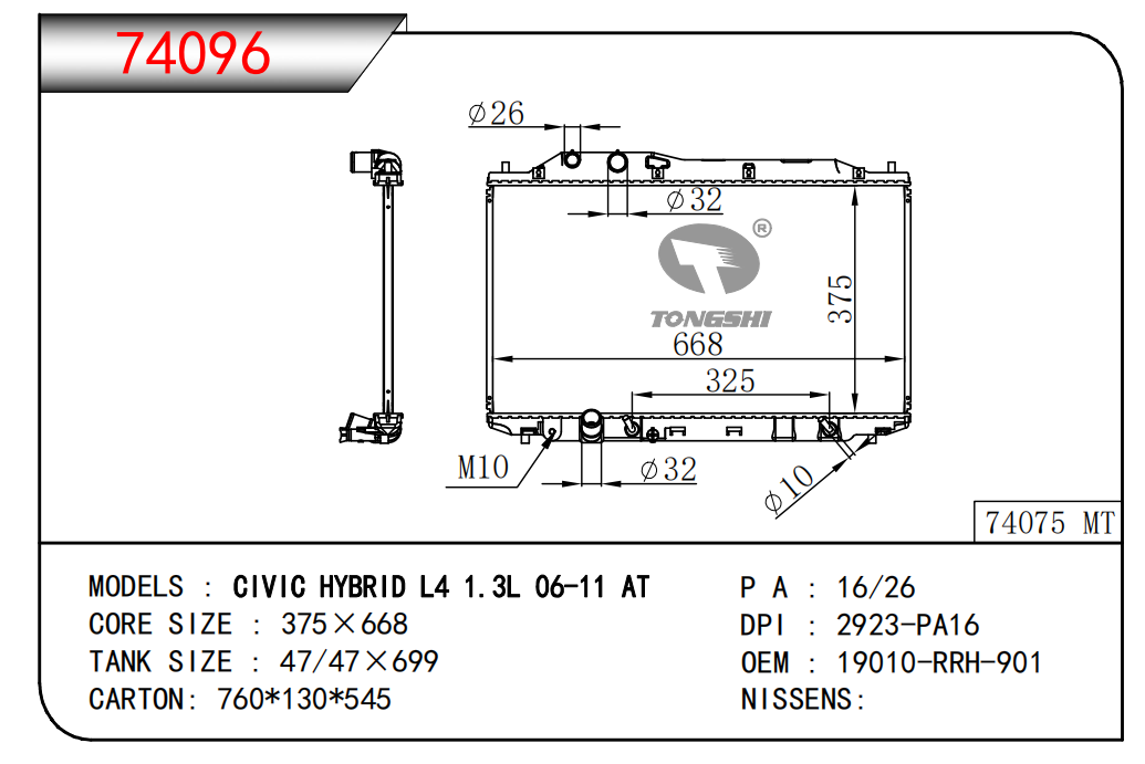 適用于奇瑞瑞虎(新款) MT散熱器 OEM : F1301000B1
