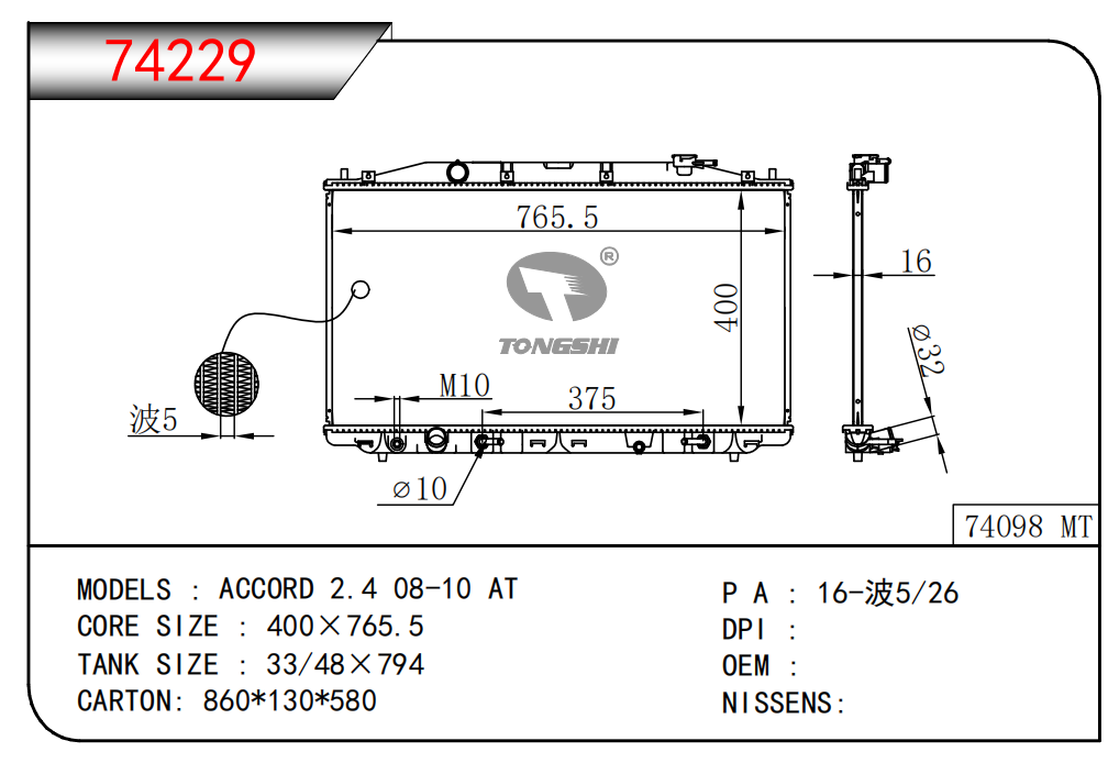 適用于奇瑞瑞虎(新款) MT散熱器 OEM : F1301000B1