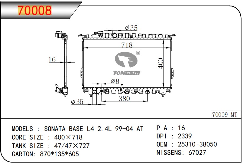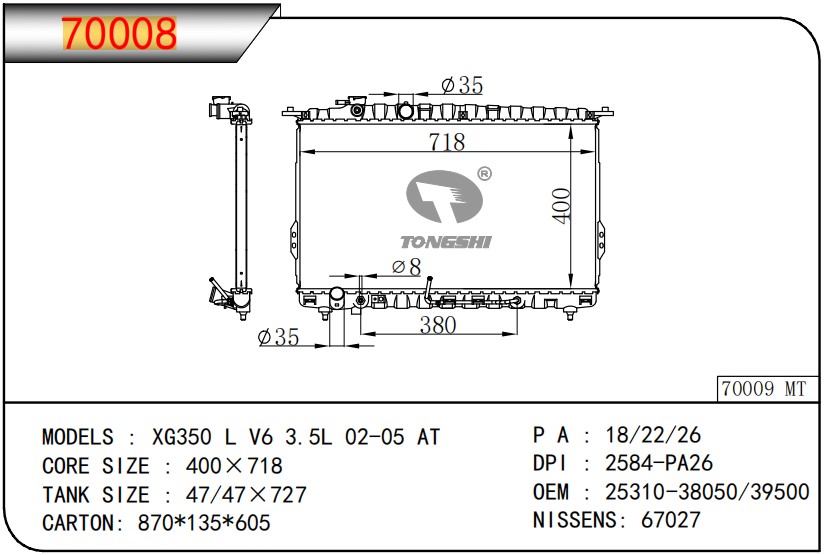 適用于奇瑞瑞虎(新款) MT散熱器 OEM : F1301000B1