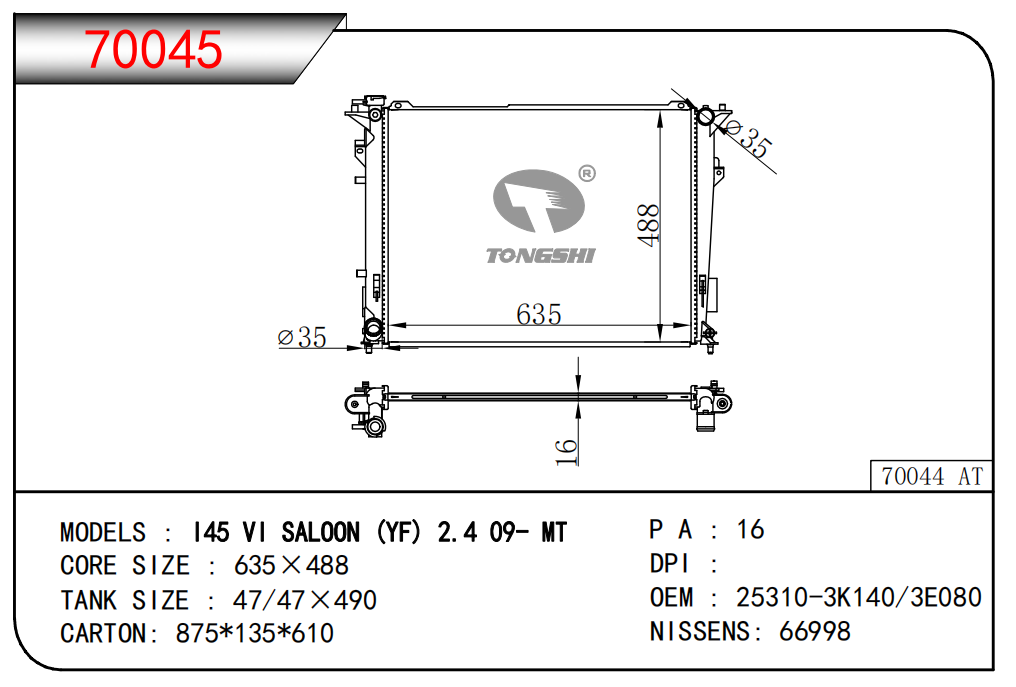 適用于奇瑞瑞虎(新款) MT散熱器 OEM : F1301000B1