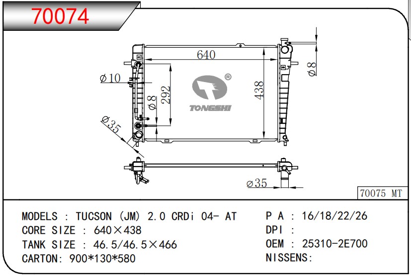 適用于奇瑞瑞虎(新款) MT散熱器 OEM : F1301000B1
