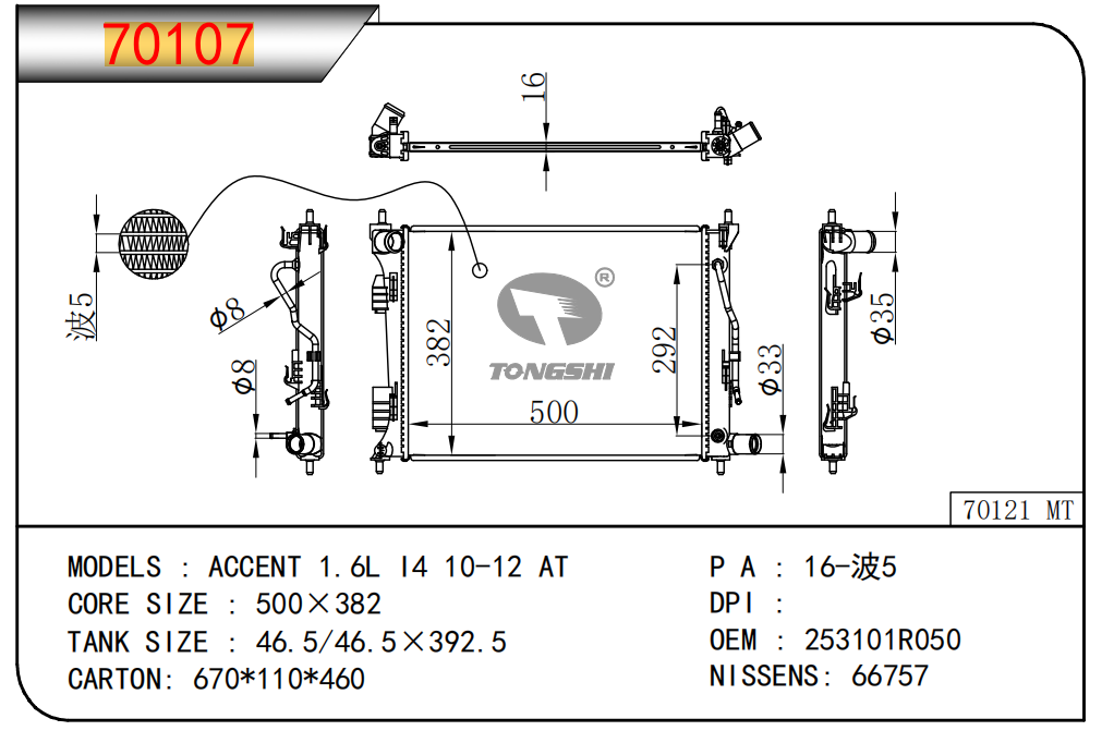 適用于奇瑞瑞虎(新款) MT散熱器 OEM : F1301000B1