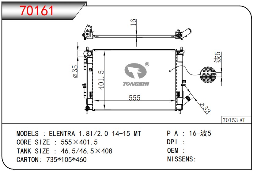 適用于奇瑞瑞虎(新款) MT散熱器 OEM : F1301000B1