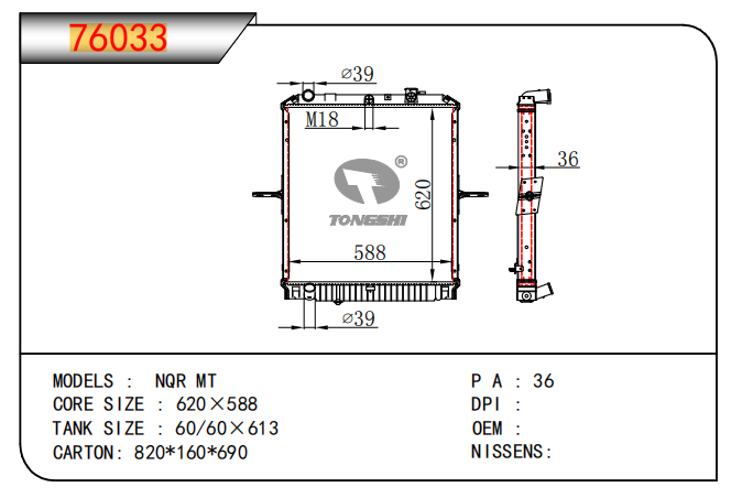 適用于奇瑞瑞虎(新款) MT散熱器 OEM : F1301000B1