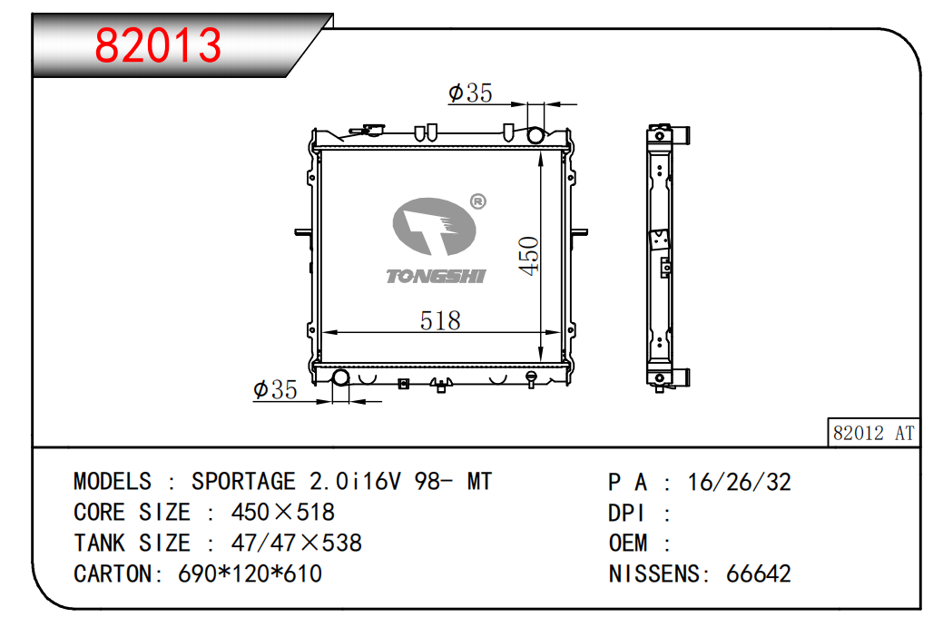 適用于奇瑞瑞虎(新款) MT散熱器 OEM : F1301000B1