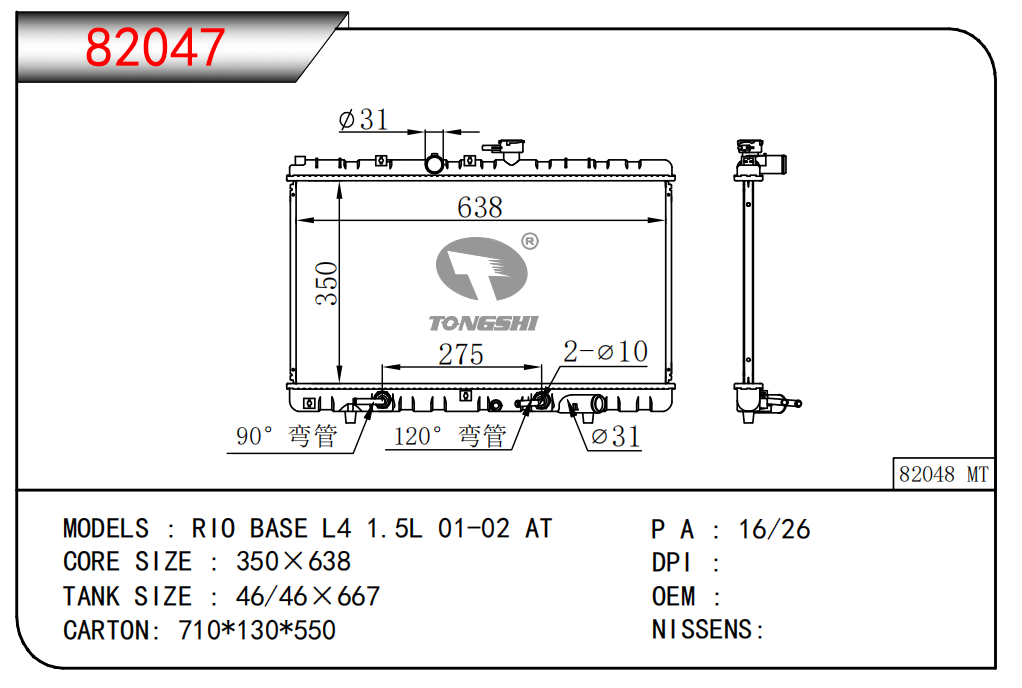 適用于奇瑞瑞虎(新款) MT散熱器 OEM : F1301000B1