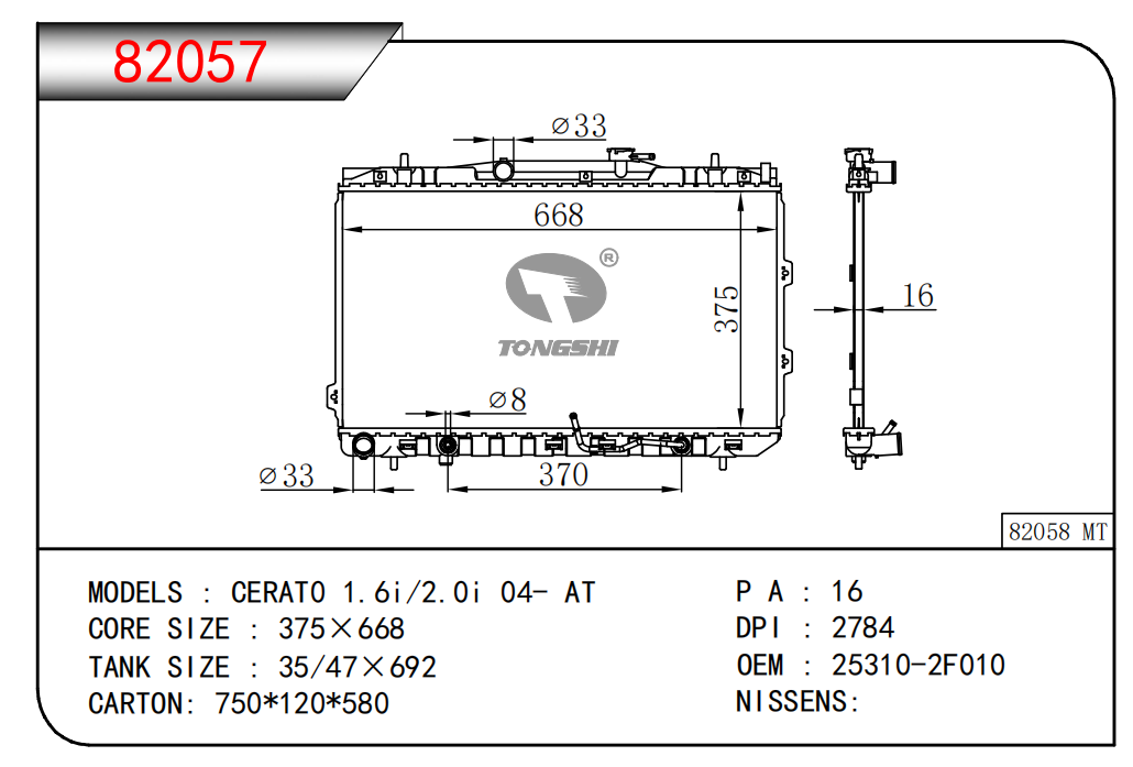 適用于奇瑞瑞虎(新款) MT散熱器 OEM : F1301000B1