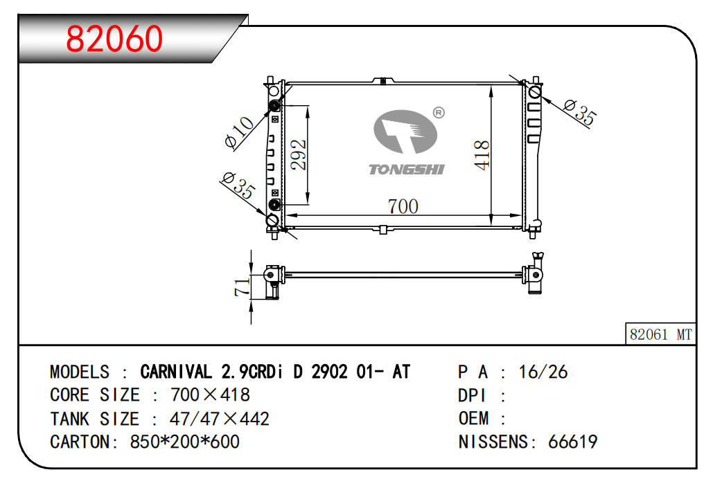 適用于奇瑞瑞虎(新款) MT散熱器 OEM : F1301000B1