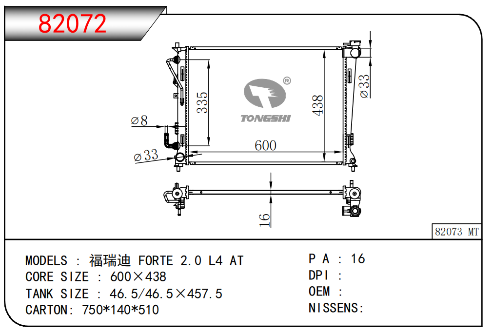 適用于奇瑞瑞虎(新款) MT散熱器 OEM : F1301000B1