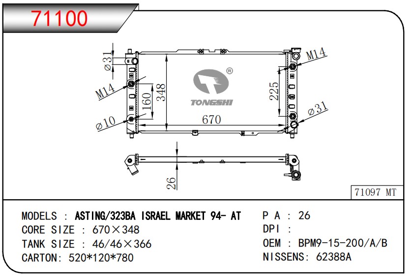 適用于奇瑞瑞虎(新款) MT散熱器 OEM : F1301000B1