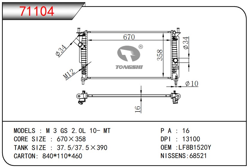 適用于奇瑞瑞虎(新款) MT散熱器 OEM : F1301000B1