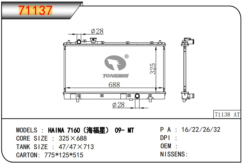 適用于奇瑞瑞虎(新款) MT散熱器 OEM : F1301000B1