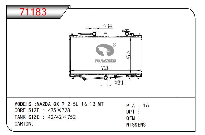 適用于奇瑞瑞虎(新款) MT散熱器 OEM : F1301000B1