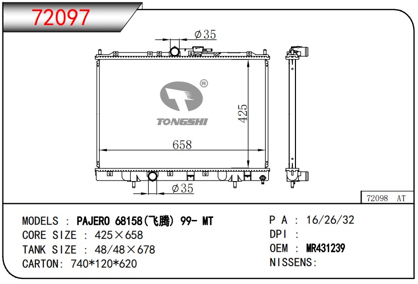 適用于奇瑞瑞虎(新款) MT散熱器 OEM : F1301000B1