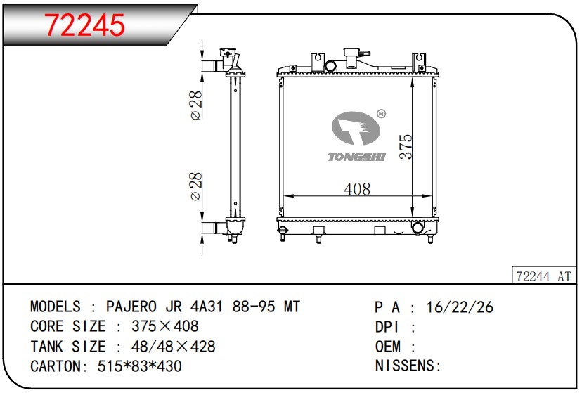 適用于奇瑞瑞虎(新款) MT散熱器 OEM : F1301000B1