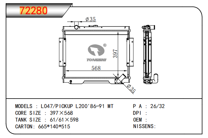 適用于奇瑞瑞虎(新款) MT散熱器 OEM : F1301000B1