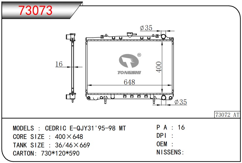 適用于奇瑞瑞虎(新款) MT散熱器 OEM : F1301000B1