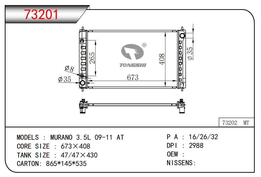 適用于奇瑞瑞虎(新款) MT散熱器 OEM : F1301000B1