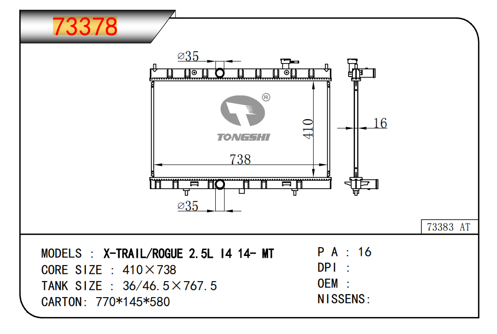 適用于奇瑞瑞虎(新款) MT散熱器 OEM : F1301000B1