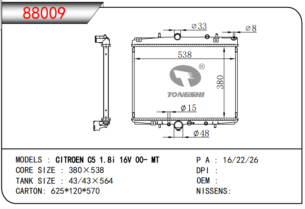 適用于奇瑞瑞虎(新款) MT散熱器 OEM : F1301000B1