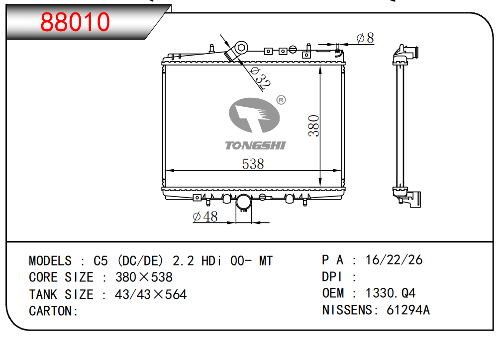 適用于奇瑞瑞虎(新款) MT散熱器 OEM : F1301000B1