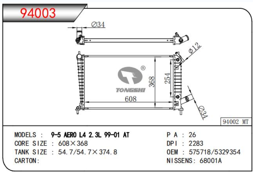 適用于奇瑞瑞虎(新款) MT散熱器 OEM : F1301000B1