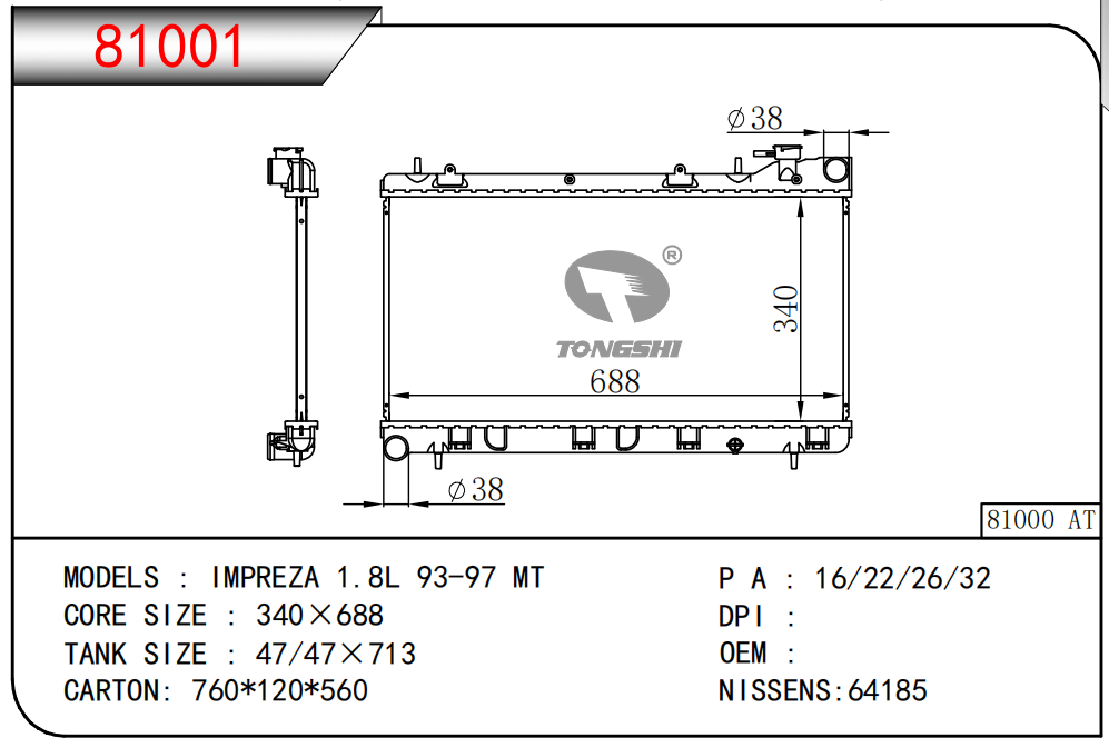 適用于奇瑞瑞虎(新款) MT散熱器 OEM : F1301000B1
