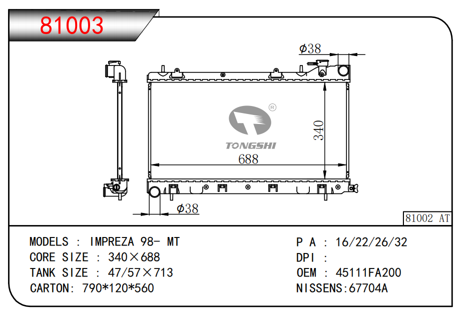 適用于奇瑞瑞虎(新款) MT散熱器 OEM : F1301000B1