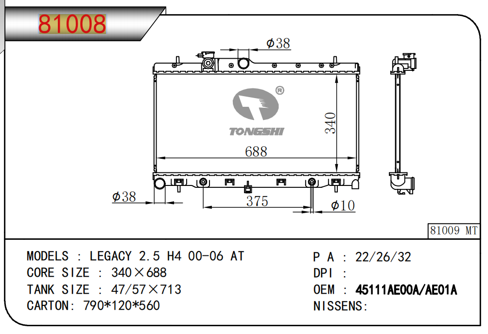 適用于奇瑞瑞虎(新款) MT散熱器 OEM : F1301000B1