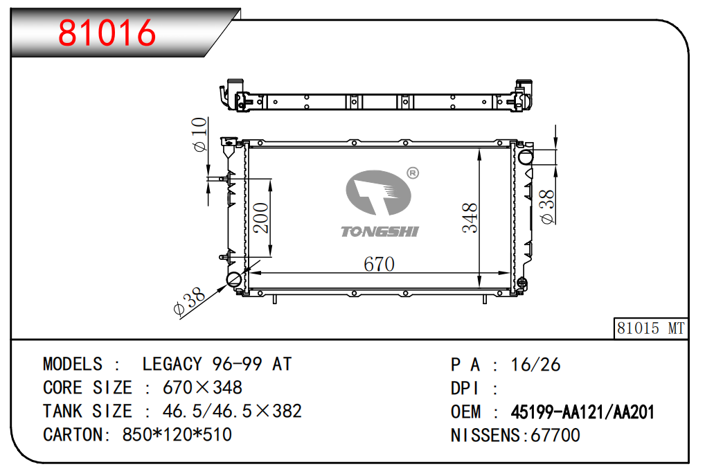 適用于奇瑞瑞虎(新款) MT散熱器 OEM : F1301000B1