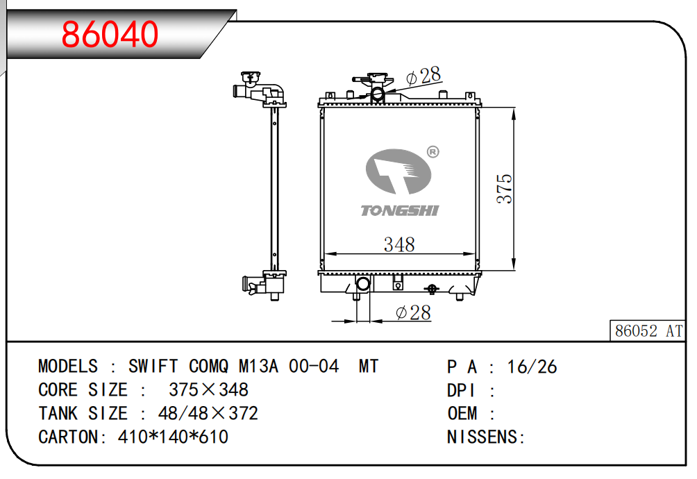 適用于奇瑞瑞虎(新款) MT散熱器 OEM : F1301000B1