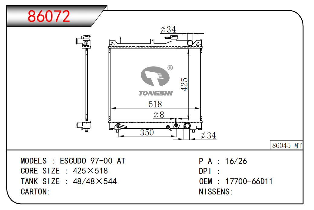 適用于奇瑞瑞虎(新款) MT散熱器 OEM : F1301000B1