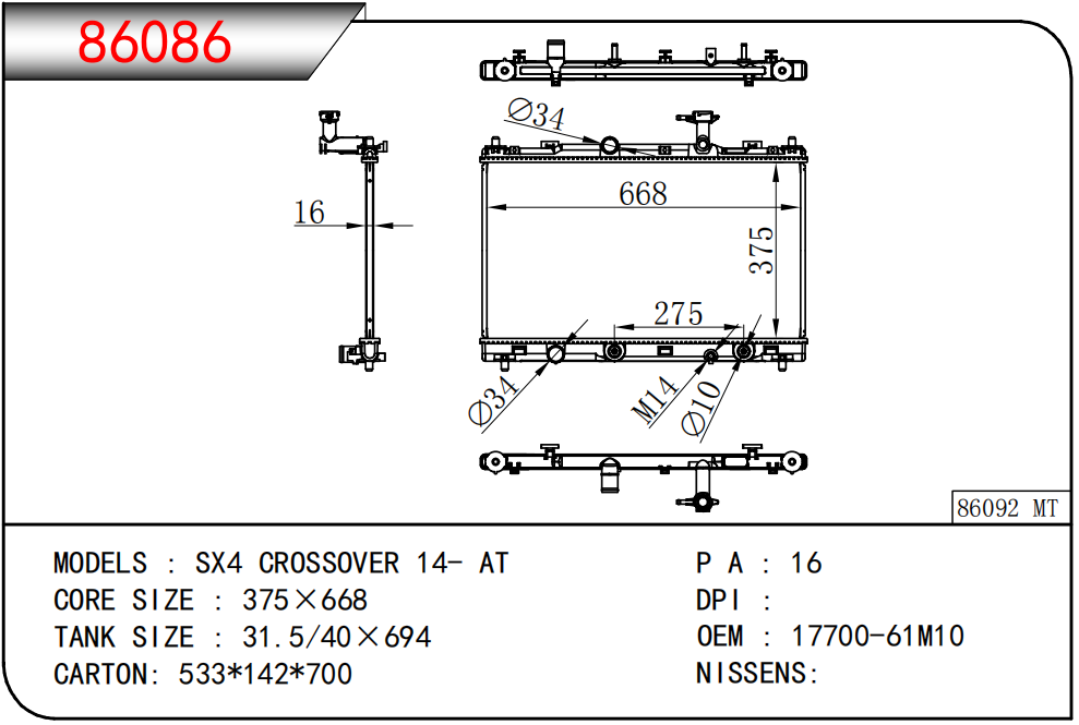 適用于奇瑞瑞虎(新款) MT散熱器 OEM : F1301000B1
