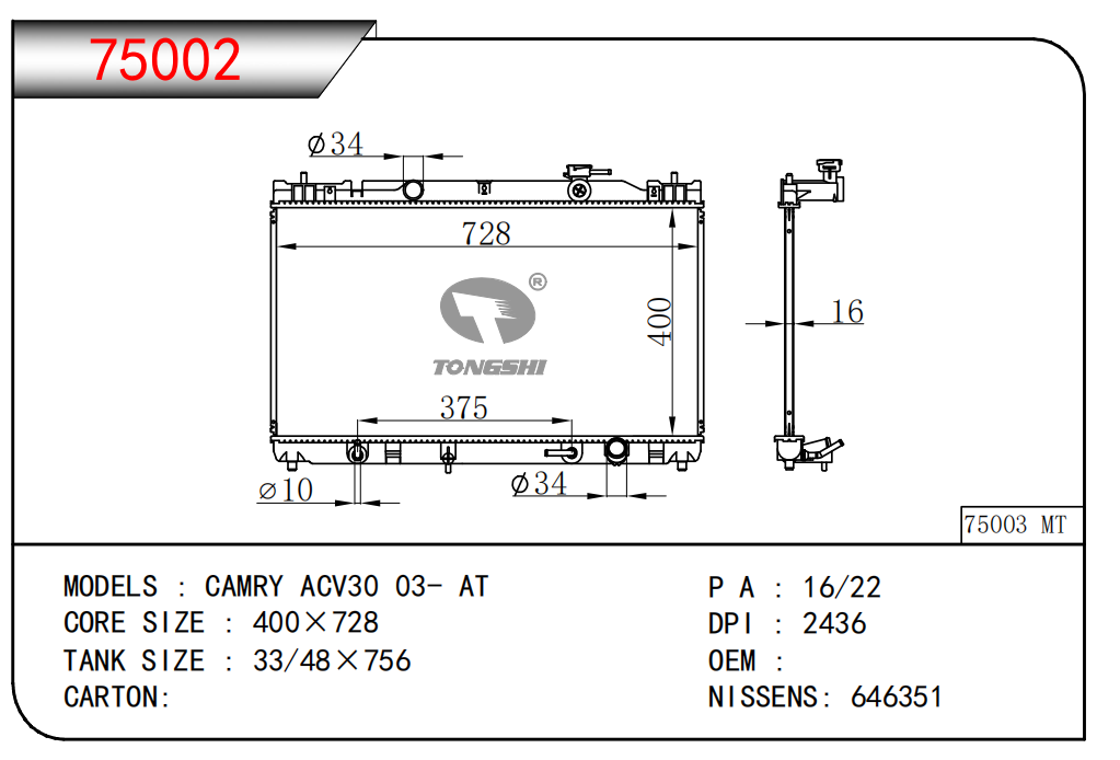 適用于奇瑞瑞虎(新款) MT散熱器 OEM : F1301000B1
