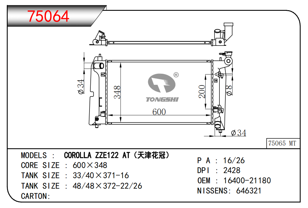 適用于奇瑞瑞虎(新款) MT散熱器 OEM : F1301000B1