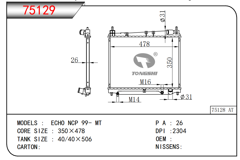 適用于奇瑞瑞虎(新款) MT散熱器 OEM : F1301000B1